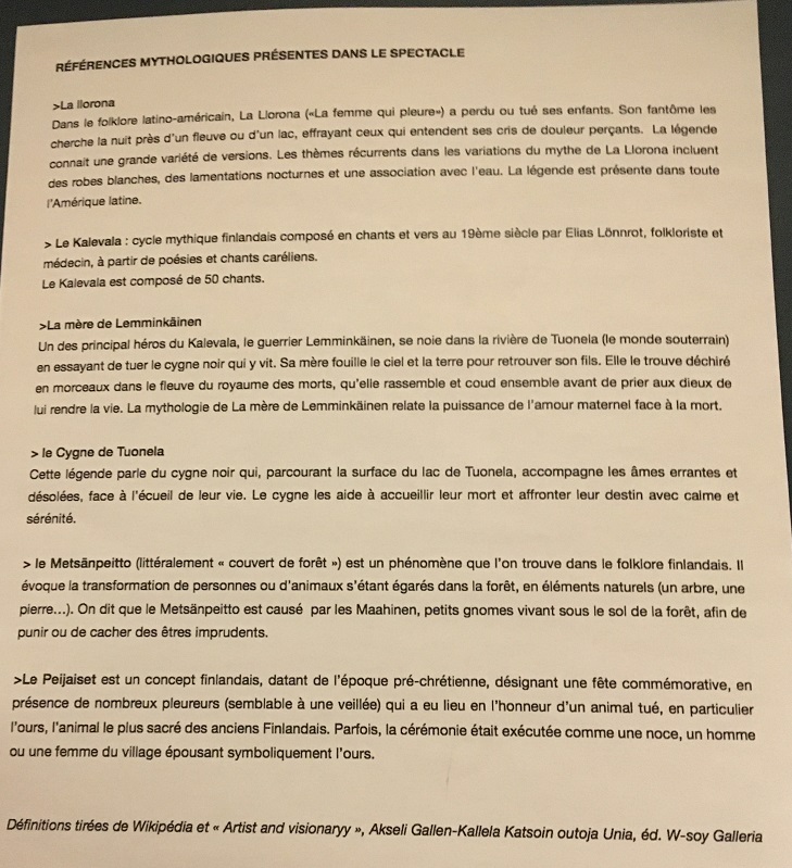 Le dépliant distribué au public avant l’entrée présente, lui, les références mythologiques, au nombre de 6. Cinq d’entre elles réfèrent à la Finlande. La sixième provient d’Amérique latine.