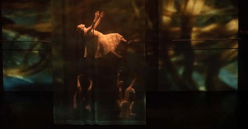 Des images… sobres et flamboyantes à la fois, par moments… poétiques, toujours… Des tableaux vivants, comme cette joueuse de kantele tenant un mouchoir d’une main et embrassant un arbuste de l’autre. Ou encore la traîne plus longue que n’est large la scène, enveloppant littéralement les protagonistes de la jeune femme qui la porte et semble flotter. Des images projetées, filmées sur et dans un aquarium… eau glissant sur le verre derrière lequel se tient un visage, cheveux roux flottant dans l’eau, nuées de bleu et de blanc derrière lesquelles on devine les corps…