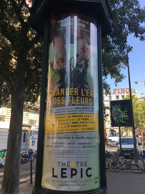 C’était aussi l’occasion rêvée de découvrir un théâtre que je n’avais jamais fréquenté, dans une rue pour moi légendaire… Me voici donc, en ce premier jour du mois de septembre tant attendu, prête à affronter la montée rude du début de cette rue. Le théâtre se situe tout en haut, à l’intersection avec la rue Junot. Je découvre que c’est le voisin du Moulin de la Galette, et me demande quels liens il a eu historiquement avec celui-ci. Il faudra que j’enquête…