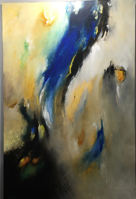 Michèle Mareuge devant une déclinaison de ses calligraphies du mot « falaise », deux tissages et un tableau