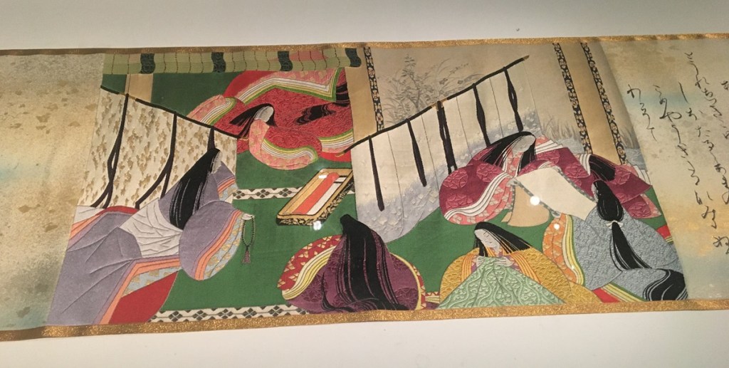 Telle fut la première réponse que j’apportai. Grâce à une conférencière exceptionnelle, j’ai appris qu’un siècle avant Chrétien de Troyes, il y avait au Japon le pendant de Marie de France… En plus grand nombre, et surtout plus disertes. Pourquoi ce qualificatif. Il suffit de voir le nombre de pages de l’oeuvre d’une d’entre elle, Musaraki Shikibu, pour le comprendre! Plus de 2000 pages. Le Dit du Genji comporte en effet 54 livres, qui en composent les trois parties.