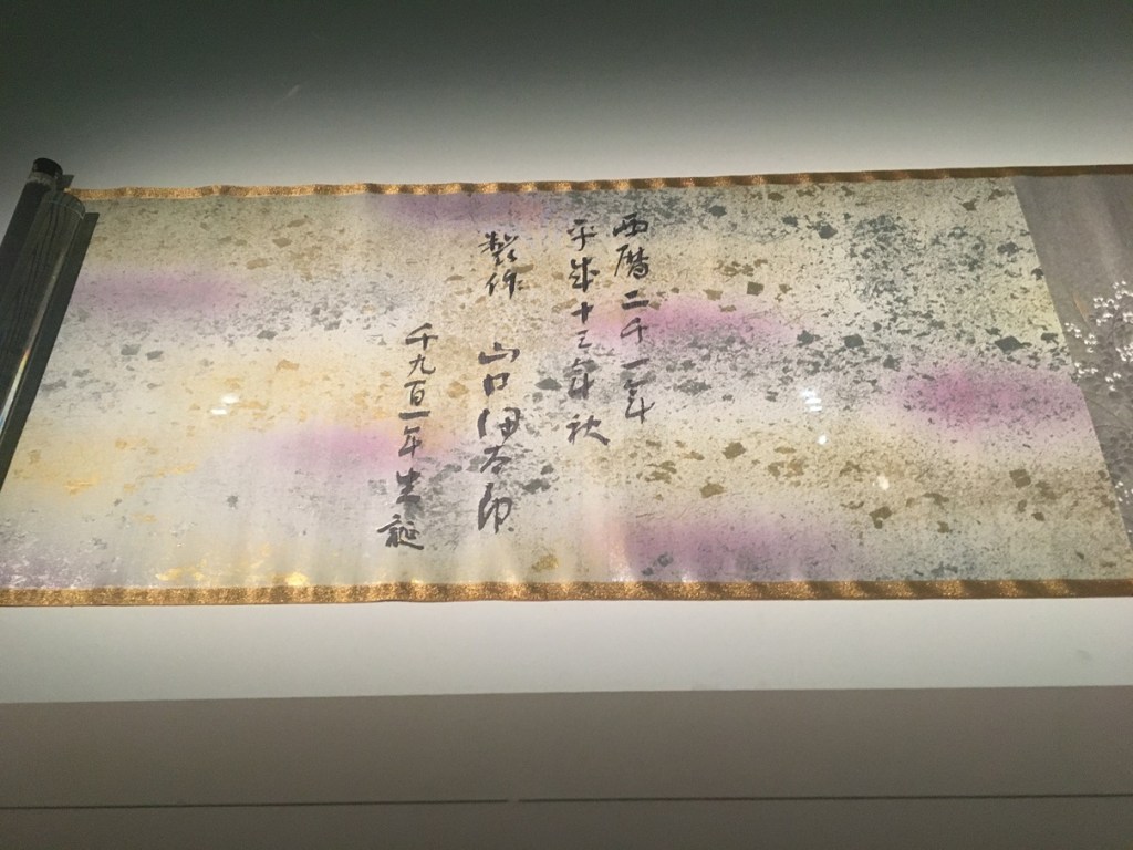 Le quartier de Nishijin, à Kyoto, est connu pour être historiquement axé sur le tissage. Des techniques spécifiques y ont été développées, et Maître Itaro Yamaguchi a participé à l’histoire de ces évolutions. Mais je ne suis pas là pour vous parler de cela. Je souhaite simplement vous faire partager l’émotion ressentie en admirant ces rouleaux présentés dans deux très longues vitrines, hélas au verre non traité : les photos sont gâchées par la lumière! Néanmoins j’espère que cela vous donnera une idée de ce que j’ai ressenti – et je n’étais pas la seule! Quelques extraits pour vous donner envie d’en découvrir davantage…