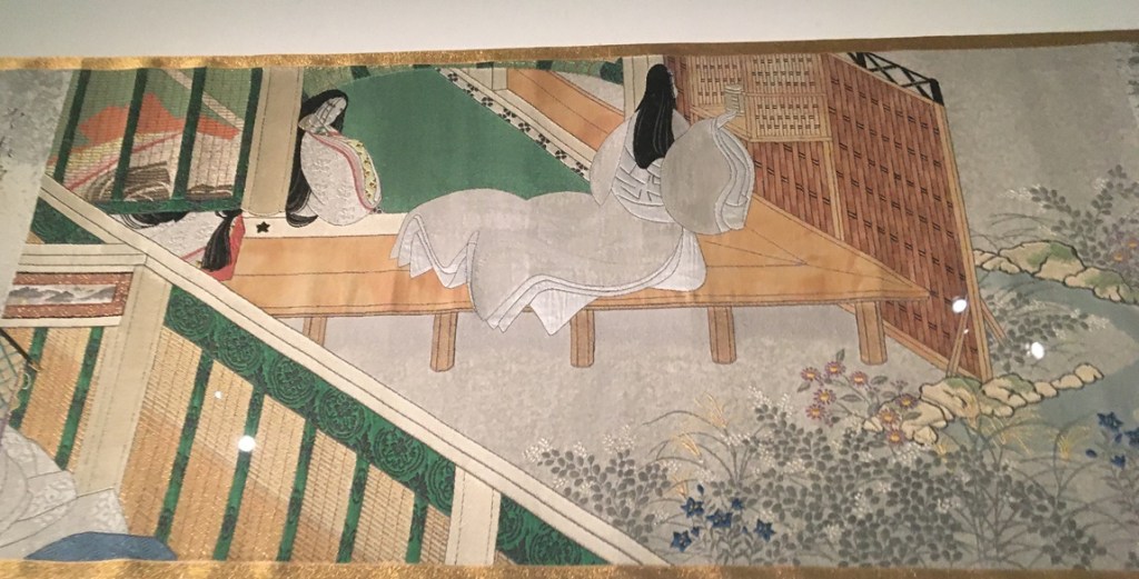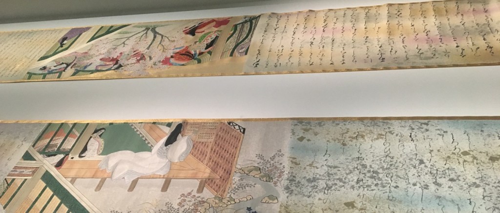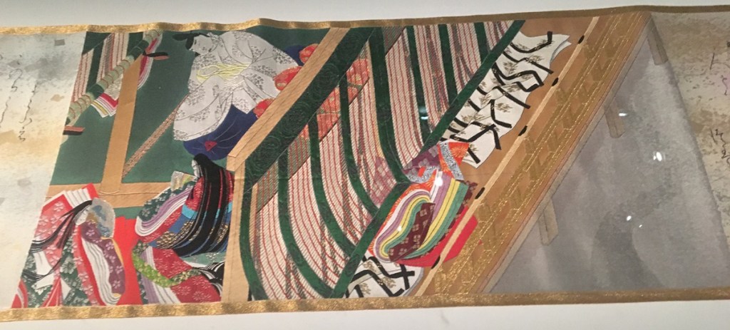 Le Musée Guimet propose régulièrement de belles expositions, qui nous entraînent dans un univers de recherche esthétique absolue. Vous en avez pu voir des traces dans ce blog à diverses reprises. C’est encore le cas actuellement, avec deux expositions reliées l’une à l’autre par un fil… de trame, si vous me permettez ce jeu de mots. En effet, la première est consacrée à un texte du XIème siècle, « Le dit du Genji », tandis que la seconde est dédiée à Maître Itaro Yamaguchi, expert du tissage, qui a entrepris, après avoir dépassé ce que les Belges nomment la septantaine, de créer des rouleaux tissés pour raconter l’histoire et l’illustrer.